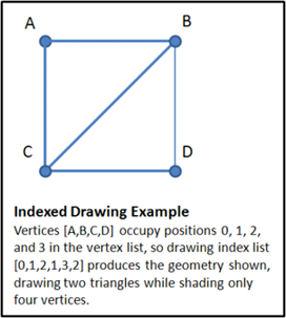 How many vertices must be shaded per triangle? You might think that for every triangle drawn, the GPU has to shade three vertices. Sometimes it does, but if vertices are shared between multiple triangles, you can usually avoid shading the same vertex twice, using a GPU feature called indexed drawing. In the simplest version, the application supplies a list of vertices and then describes triangles in terms of the positions of their vertices in the list. In the example shown below, to draw a square, the application provides vertices [A,B,C,D] and then asks to draw the two triangles defined by the index list [0,1,2,1,3,2]. The first three indices (0,1,2) select vertices [A,B,C], drawing triangle ABC. The second three indices draw triangle BDC. Presto, we've drawn two triangles but only shaded four vertices. In the limit, a clever application can draw N triangles while only shading about N/2 vertices.